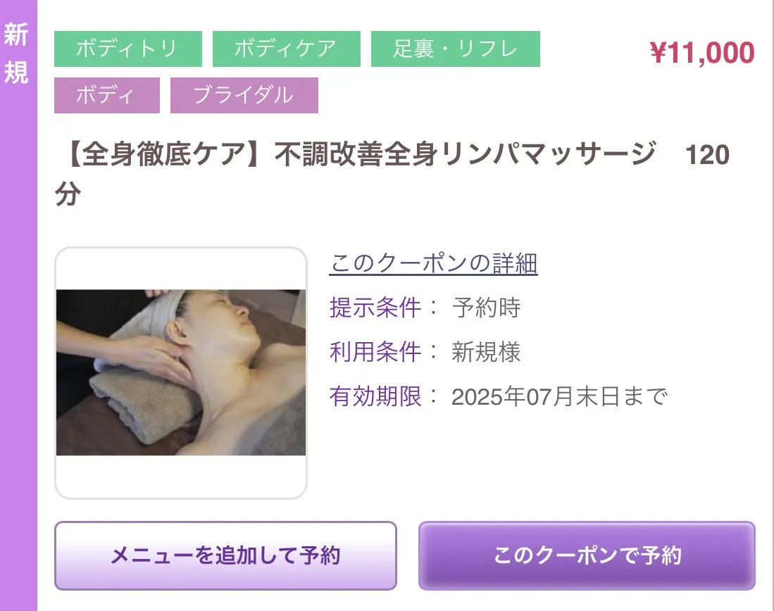 全身リンパマッサージ120分至福の2時間をお過ごしください